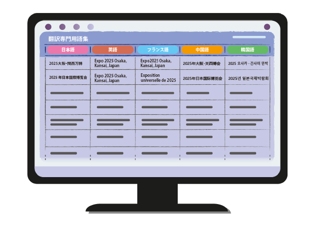 大阪・関西万博特有の専門用語を事前に収集・翻訳し登録しておくことで、表現が統一され、コミュニケーション上の混乱を防ぐことができます。大阪・関西万博にまつわる会話の正確かつスムーズな翻訳につながります。