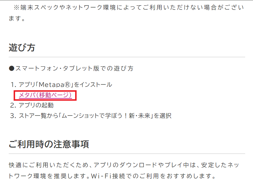 1,下記のリンクにアクセスし、「遊び方」の項目から「メタパ(移動ページ)」をクリック。