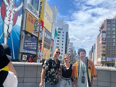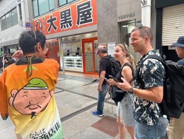 ツアーはなんば広場からスタートし、賑やかな戎橋筋商店街を通り抜け、情緒ある法善寺でのお参り、そしてグリコの看板などの道頓堀名所を巡る魅力的なコースでした。外国人だけでなく、日本人にとっても新しい発見がある内容でした。