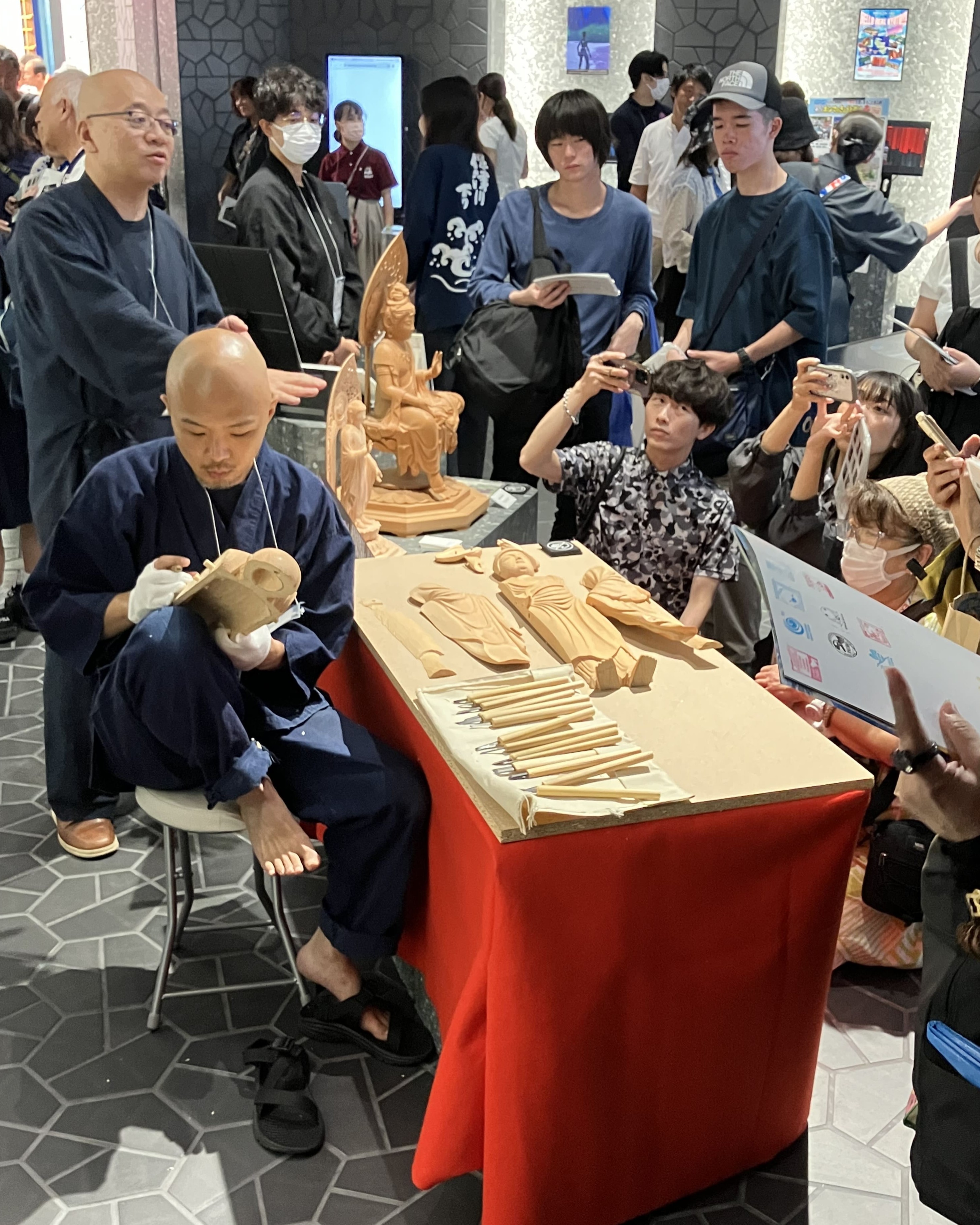 (左)京都の仏像文化を身近に感じられる仏像の木彫り実演。