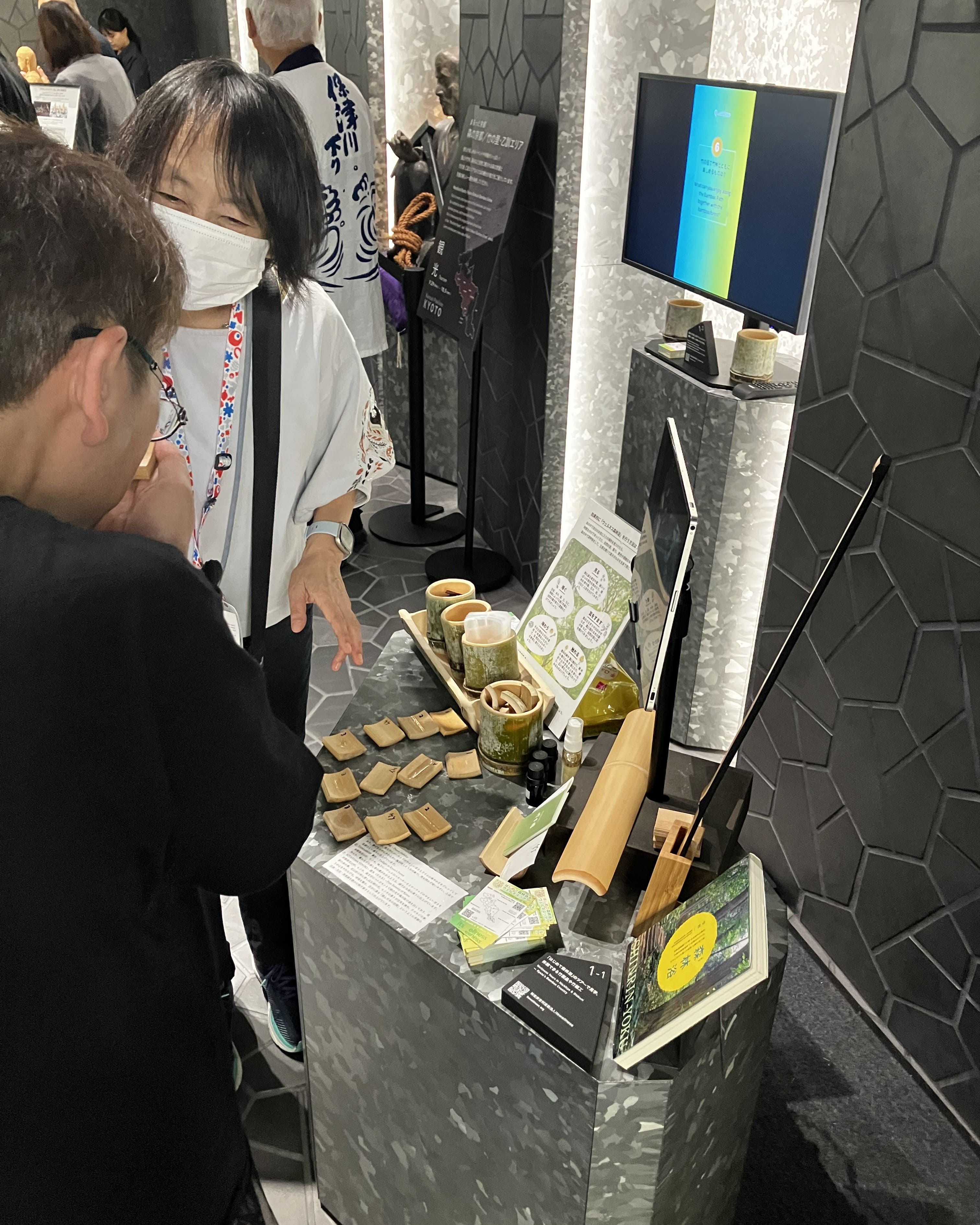 (右)京都の竹の使った上質な竹製品、竹細工の展示。